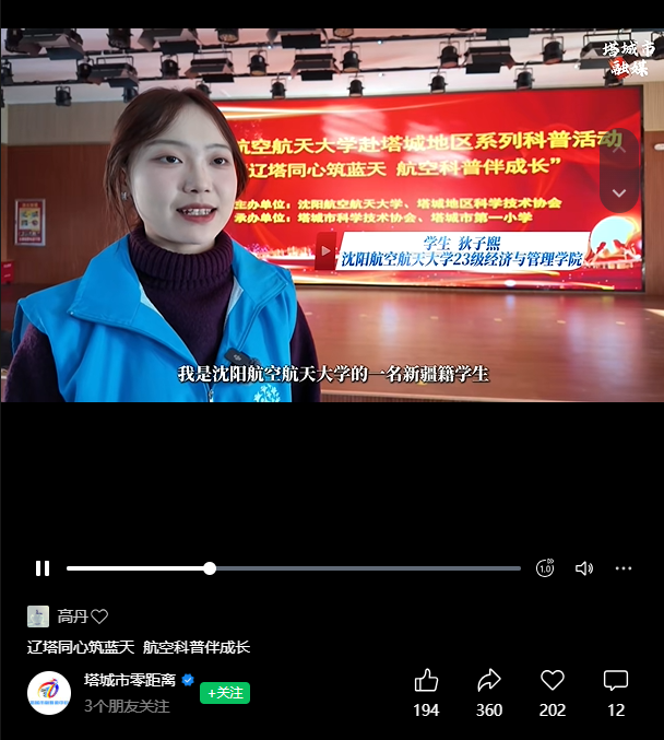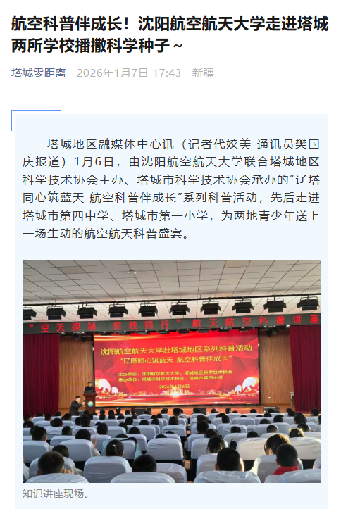 学校科普志愿服务团队走进塔城市第四中学、第一小学及新疆生产建设兵团第九师小白杨中学,以“科普讲座+航模实操”的形式带来沉浸式航空盛宴。