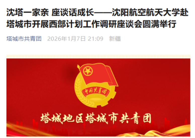 调研团队及学生代表赴塔城市共青团,围绕西部计划项目开展专题调研座谈,以青春力量助力西部发展,让沈航红蓝文化在边疆落地生根。会上,第三届全国大学生职业规划大赛校赛金奖获得者、新疆昌吉回族姑娘狄子熙,结合参赛作品《以青春之名 赴西部之约》进行答辩汇报。作为一名新疆籍学子,她将个人职业目标与家乡发展紧密相连,立志通过 “大学生志愿服务西部计划”扎根新疆基层,成为一名服务家乡的青年工作者。答辩中,她深度融合沈航 “立足航空、明德育人、求实拓新、志在卓越”的办学宗旨,生动诠释了从 “走出去”"求学、到“归来去”建设的青春抉择,展现了新时代大学生与祖国同频共振、回报家乡的责任担当。